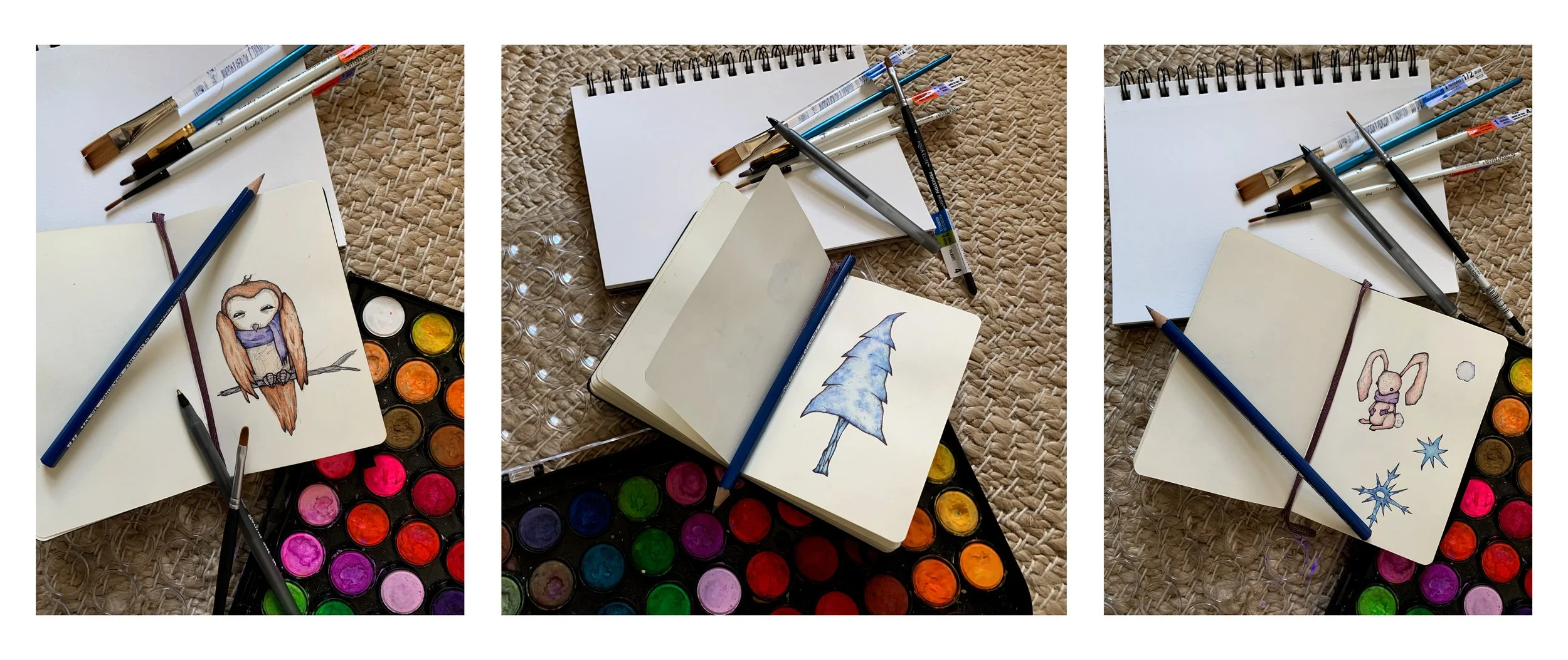 Since Blizzard Blues is an older project, all illustrations/motifs were done in slightly different style on a smaller scale in a sketchbook. The patterns were reworked from the originals while still keeping the initial illustrations.